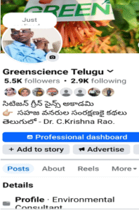 I run a Facebook page titled “Greenscience Telugu”, dedicated to educating people in the Telugu-speaking states about forests, the environment, and sustainable living. The page has received an overwhelming response, often reaching between 1,000 and 80,000 views within just 24 hours. This enthusiastic engagement reflects the growing public interest in environmental awareness and reinforces my commitment to spreading knowledge on forest conservation and ecology in the Telugu language.